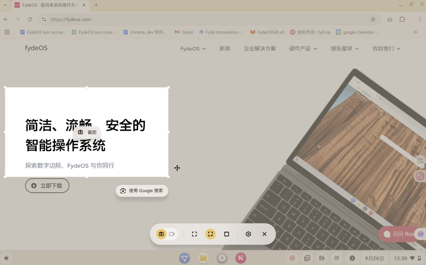 用户截取图片后,FydeOS 将提供选项,可直接从图片中「复制文本」或使用搜索引擎「搜索选中的内容」。