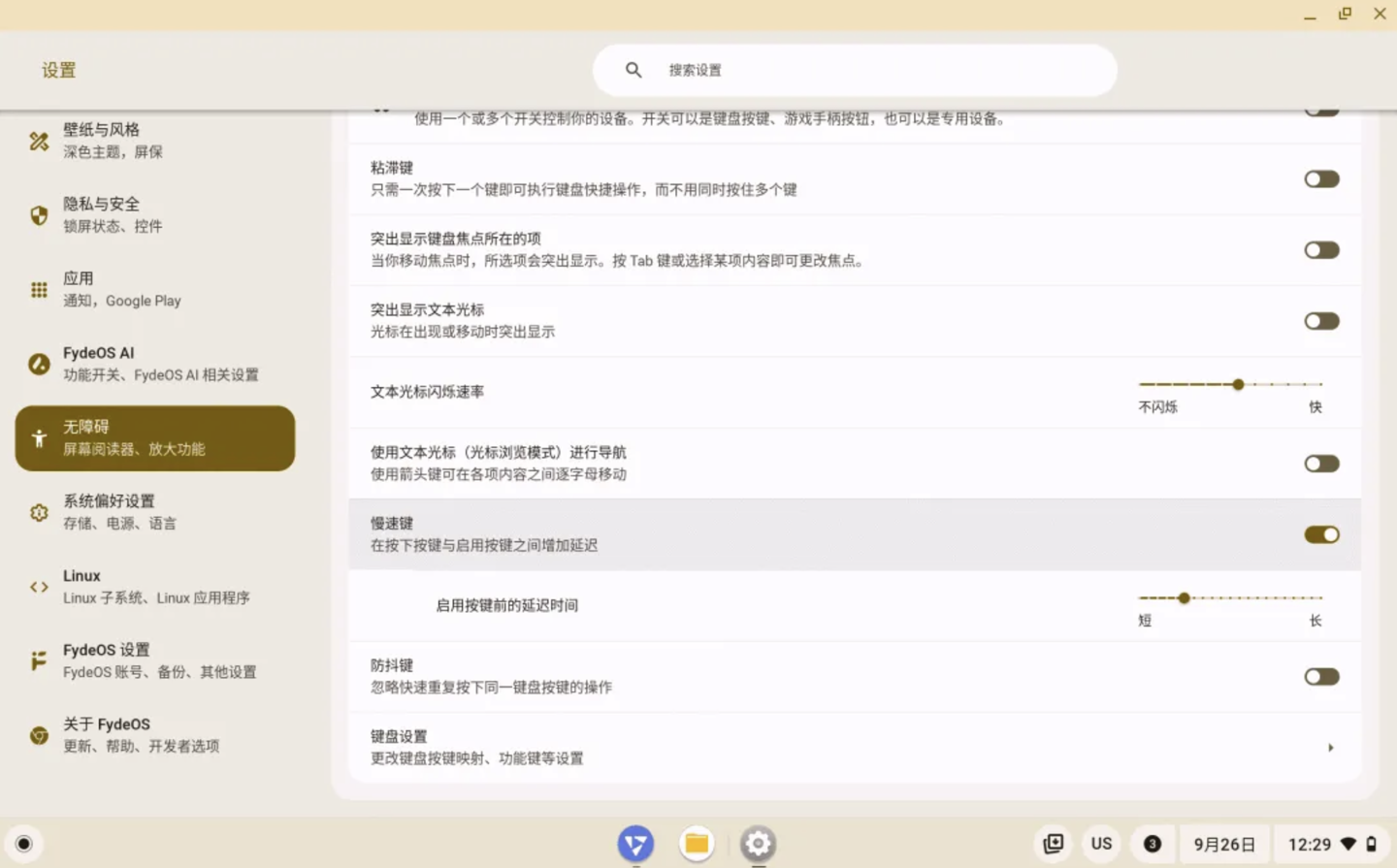 注:「独立式 Web 应用」必须通过 FydeOS 云集管平台进行部署和管理。无障碍功能改进鼠标键相应功能允许用户使用键盘来控制鼠标指针,为不便使用传统鼠标的用户提供了替代方案。用户可以在「设置」菜单的「无障碍」部分启用和配置「鼠标键」。