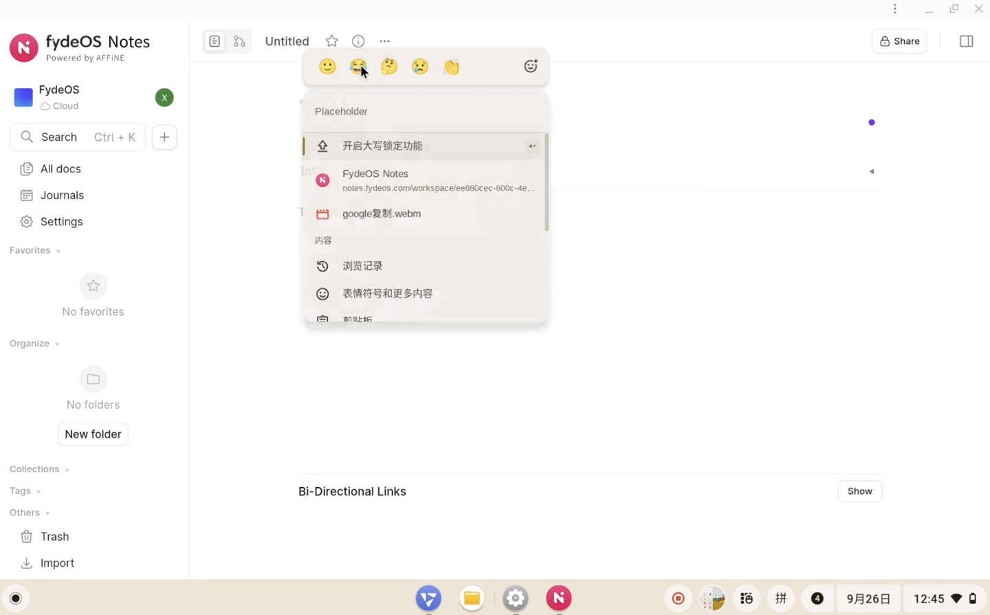 FydeOS v21 新增「快速插入」功能,可以让用户更轻松地表达自我。只需按下 Windows / Command + f 组合键,即可立即唤出面板,搜索并插入 Emoji 等富文本内容到文档和对话中。